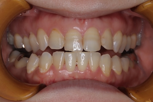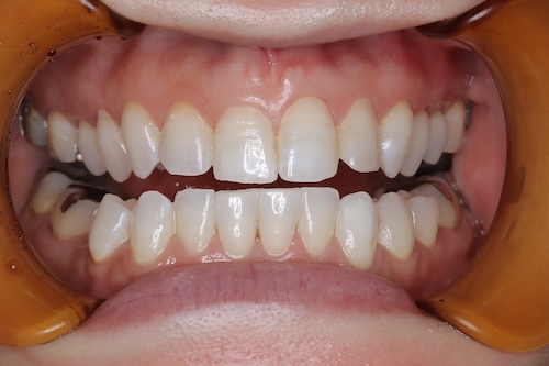 上の前歯の縞模様な感じが一番気になり上前歯を今より白くし、白くなった後のキープもしたいお客様の症例。