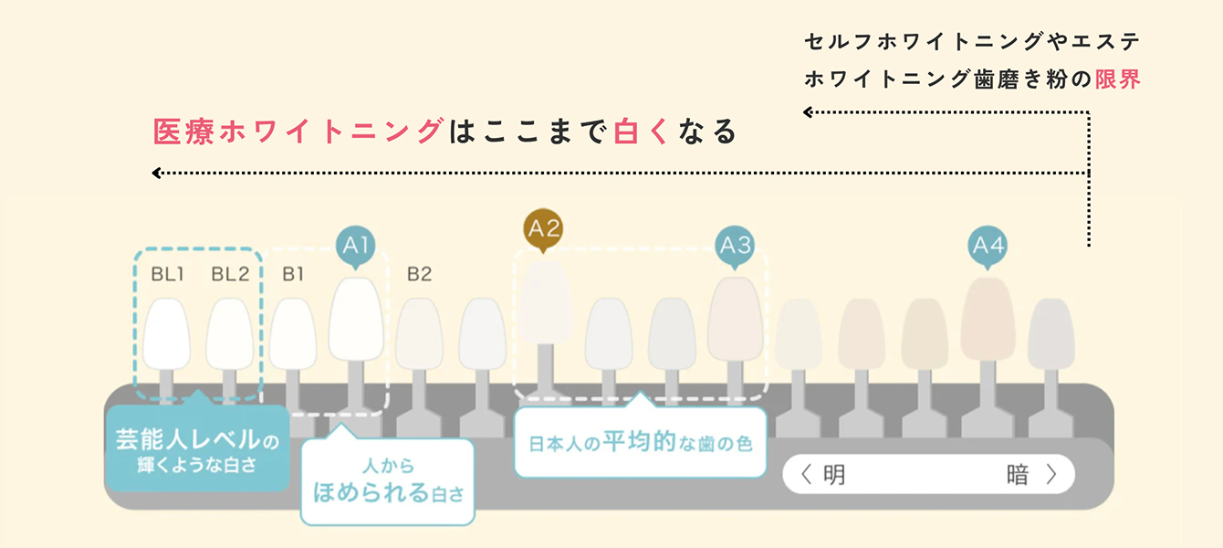エステサロンのホワイトニングやセルフホワイトニングでは、歯を白くする効果のある医薬品を使えないことが法律により定められています。このため、歯の色はやや明るくなるものの、希望する白さにすることや、元々の歯の色よりも白くすることはできません。Beauteでは歯科医院でしか使用できない薬剤を使用しており、ご希望の白さを目指していただけます。
