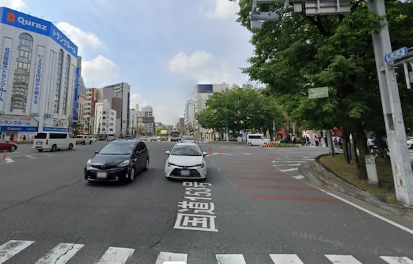 最初の大きな交差点「葵町西」が見えてきます。この交差点を左に曲がり、さらに広小路通と合流する方向(左)へ直進してください。