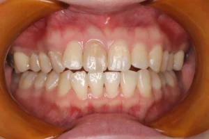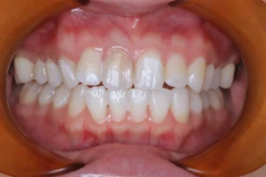 それに加えて、周囲の歯の色味も濃く感じるようになり、全体的な印象を改善したいとのことでご相談くださいました。初診時のシェードは左上1番がA3、右下3番がA3.5と、全体的に濃い色味が確認できたため、回数をかけてじっくり白さを引き上げていく進め方となりました。